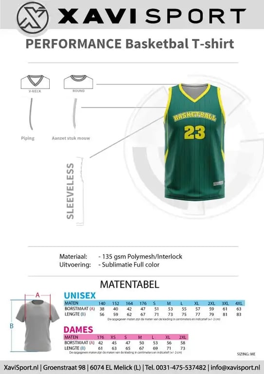 Hieronder staat het informatieblad van het basketbal shirt. De maten in de matentabel zijn van de kleding. Deze maten kun je vergelijken met een goed passend vergelijkbaar kledingstuk